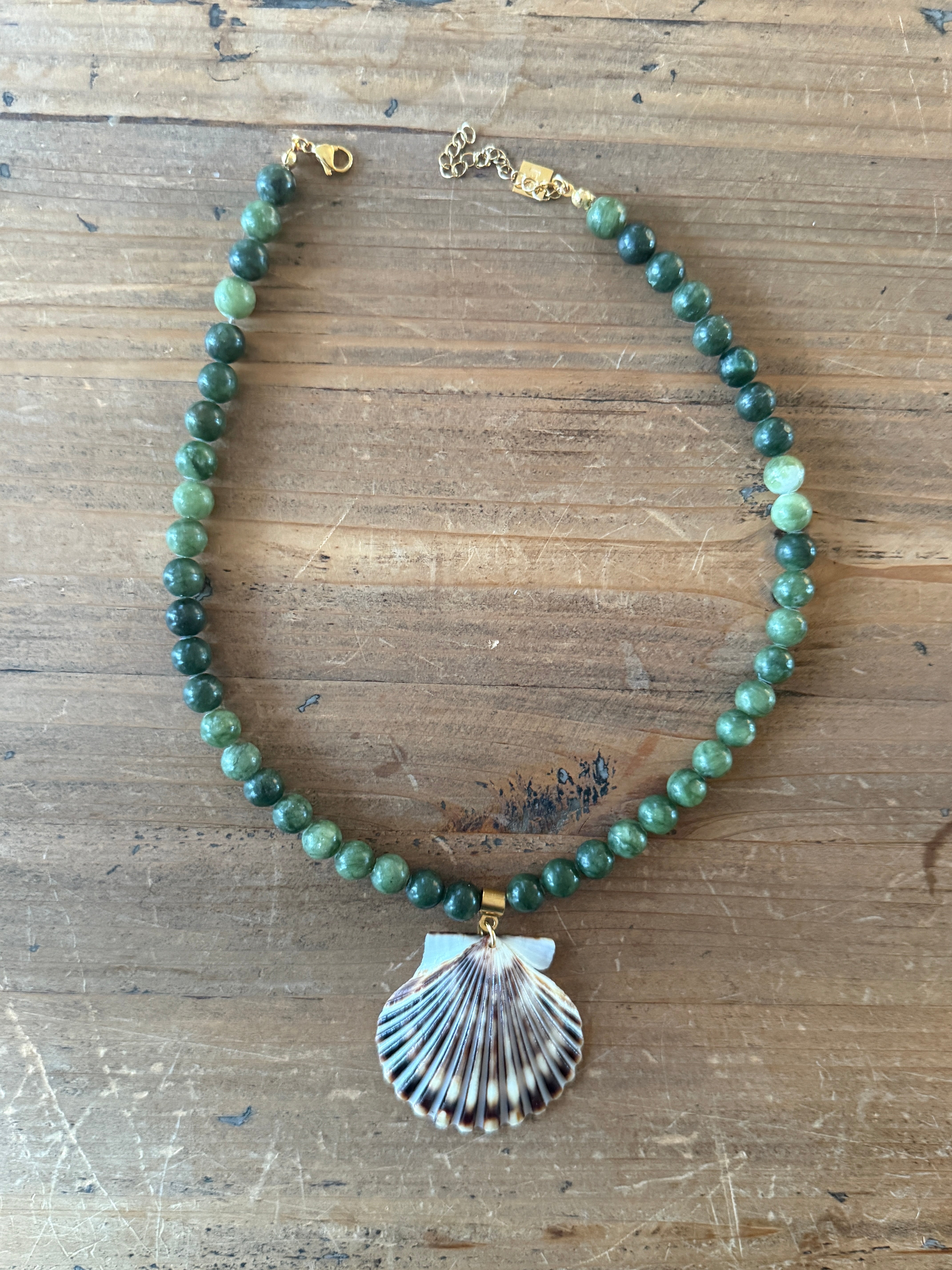 - Hardware: 24k gold-plated stainless steel — durable, hypoallergenic, water- and tarnish-resistant (won’t turn green). Each shell is suspended from a unique pendant connector, and the necklace is finished with a lobster claw clasp, a matching extension chain, and a custom-engraved square Nude Greenhouse Tag.
