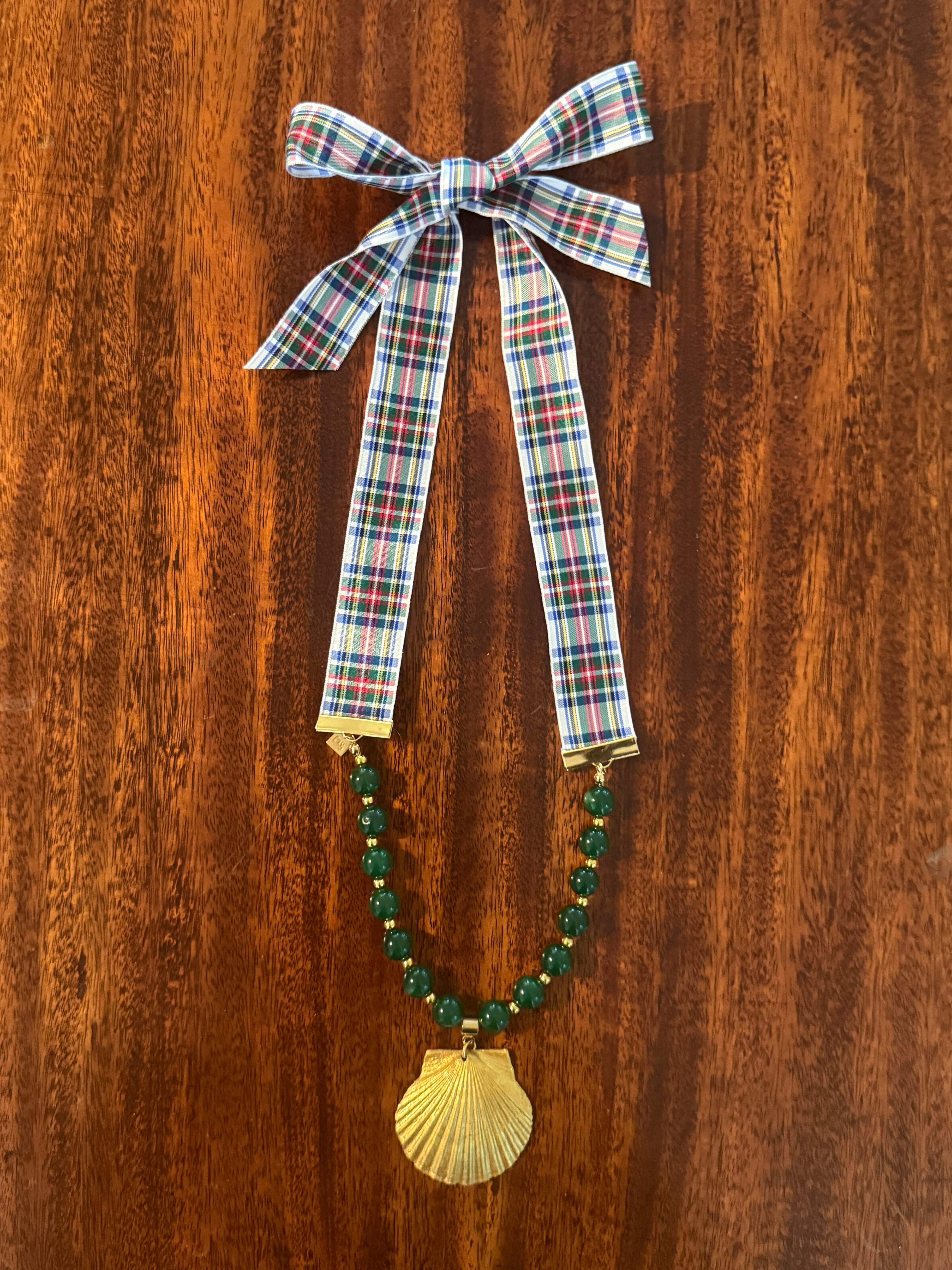 Handcrafted necklace featuring a hand-collected New England scallop shell, preserved in its natural tones or finished with gold-painted detailing. Each piece hangs from high-quality velvet or tartan ribbon from heritage mills in the United Kingdom and is finished with vintage gold clamps.