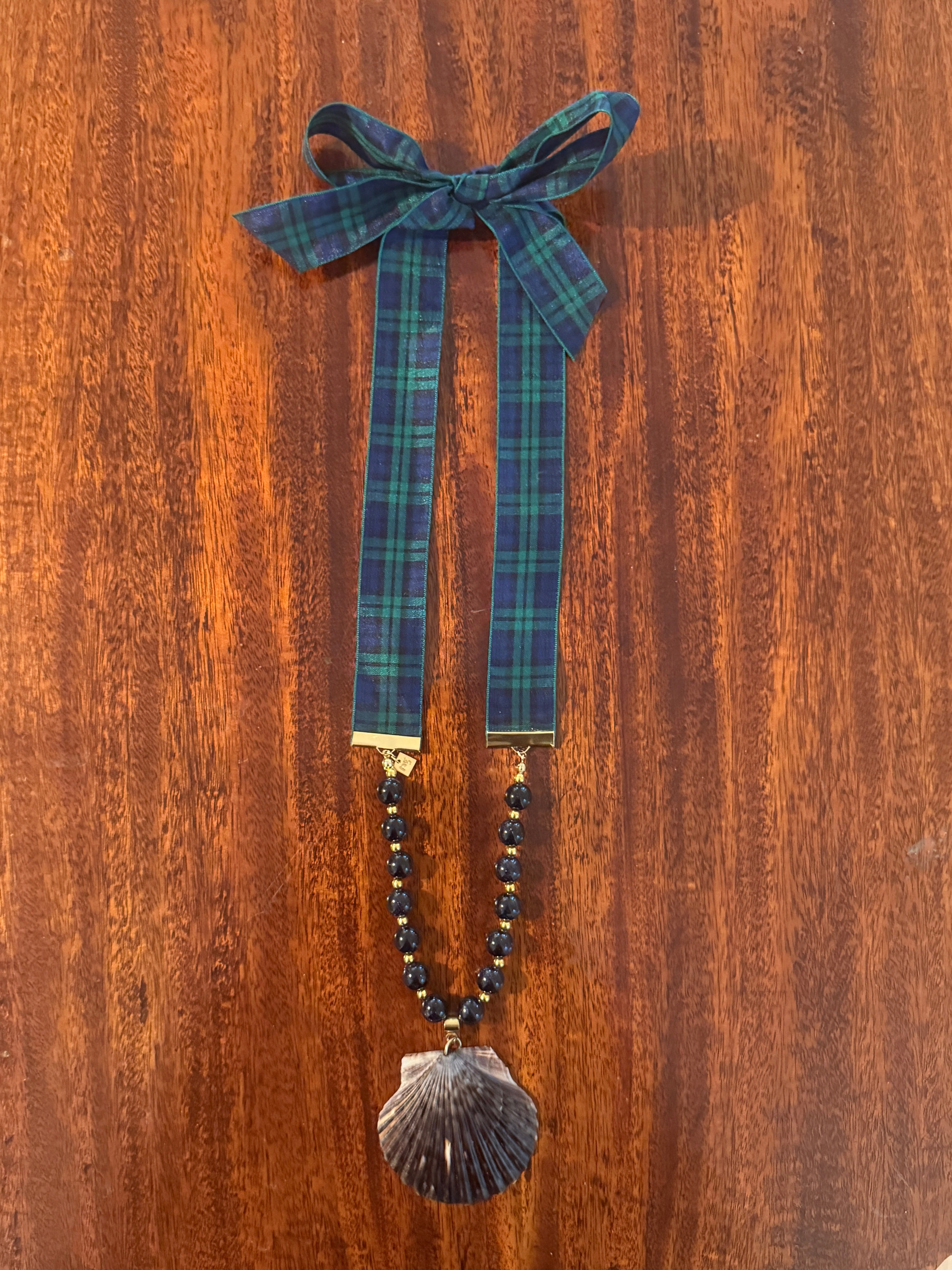 Handcrafted necklace featuring a hand-collected New England scallop shell, preserved in its natural tones or finished with gold-painted detailing. Each piece hangs from high-quality velvet or tartan ribbon from heritage mills in the United Kingdom and is finished with vintage gold clamps.