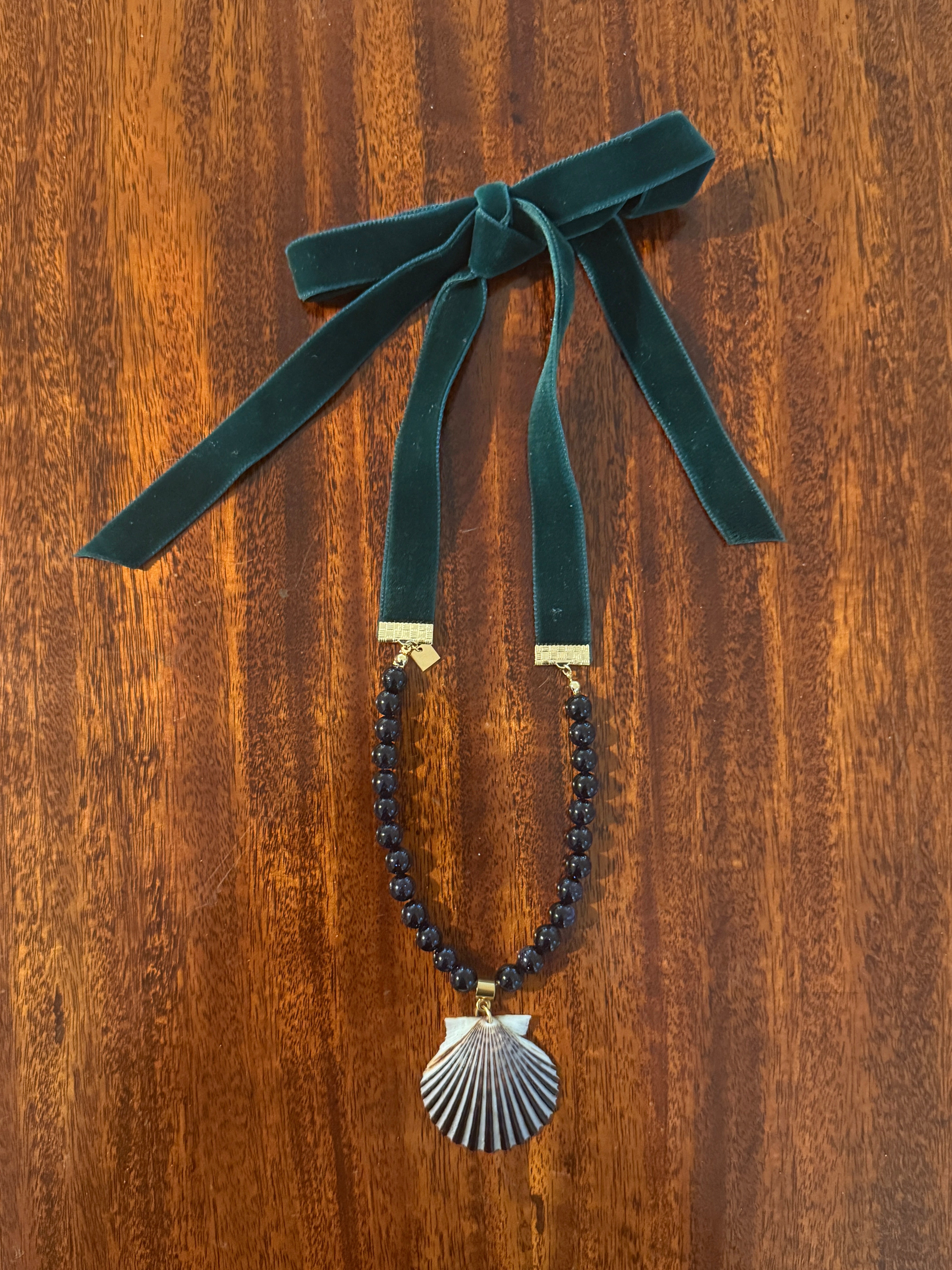 Handcrafted necklace featuring a hand-collected New England scallop shell, preserved in its natural tones or finished with gold-painted detailing. Each piece hangs from high-quality velvet or tartan ribbon from heritage mills in the United Kingdom and is finished with vintage gold clamps.