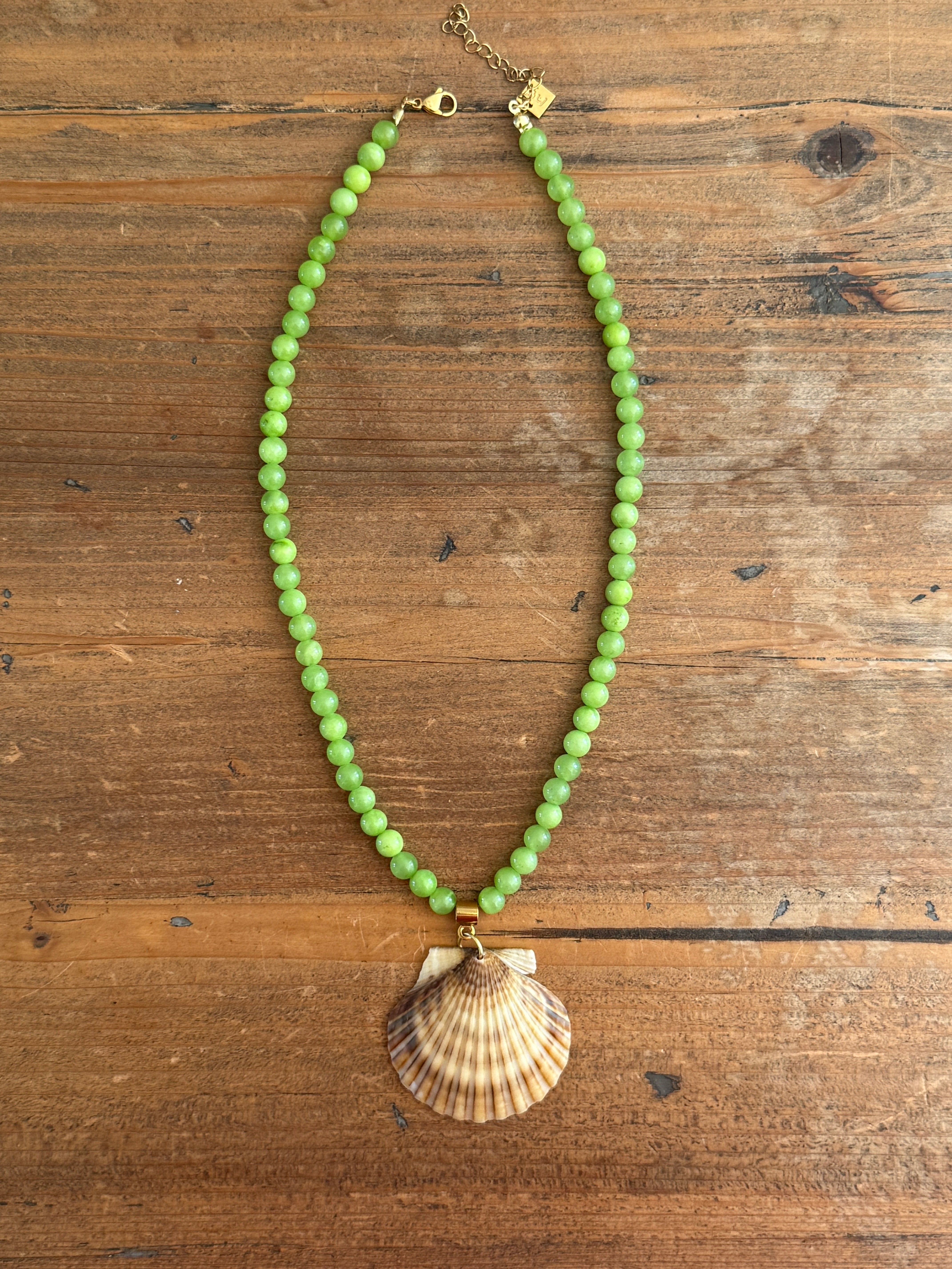 - Hardware: 24k gold-plated stainless steel — durable, hypoallergenic, water- and tarnish-resistant (won’t turn green). Each shell is suspended from a unique pendant connector, and the necklace is finished with a lobster claw clasp, a matching extension chain, and a custom-engraved square Nude Greenhouse Tag.
